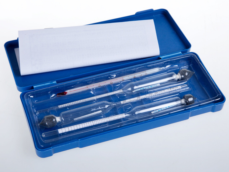 測量酒精酒度通常用酒精表、酒精計,酒精表又稱酒精比重計。酒精表是根據酒精濃度不同,比重不同,浮體沉入酒液中排開酒液的體積不同的原理而制造的。當酒精計放入酒液中時,酒的濃度越高,酒精計下沉也越多,比重也越小;反之,酒的濃度越低,酒精計下沉也越少,比重也越大。